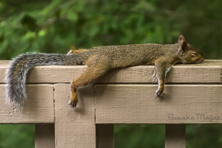 This “splooted” squirrel on my porch rail personifies my exhaustion & sore old body from getting house ready to sell.