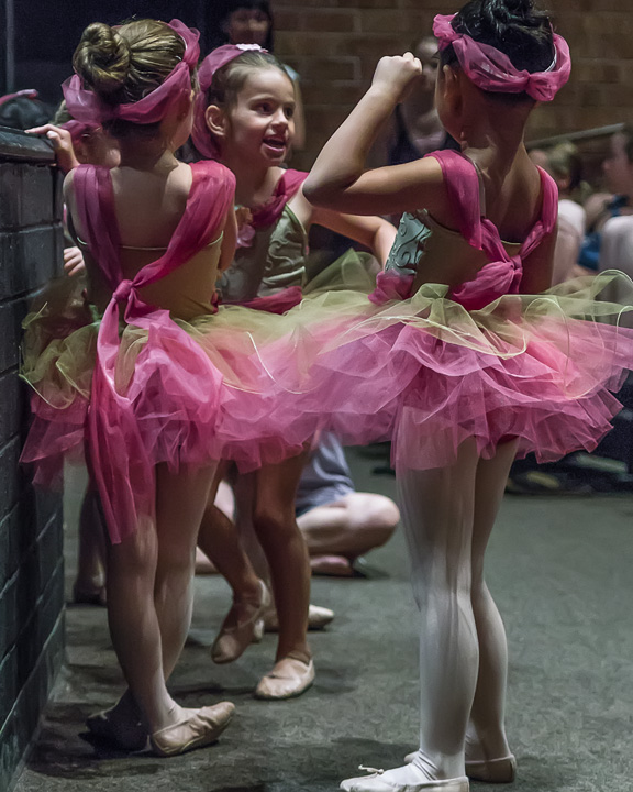 Three pre-ballet students in animated conversation before dress rehearsal. Excitement was in the air.